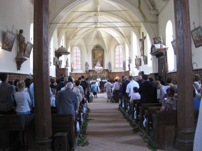 avant de gagner l'église de Saint Mathurin pour la bénédiction nuptiale prononcée par l'abbé Pierre-Emmanuel Desaint qui a célébré la cérémonie dans une église comble :