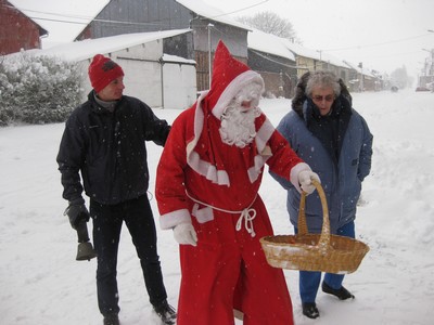 La calèche du Père Noël a du déclarer forfait et recommander aux organisateurs de se rabattre sur un traineau tiré par des chevaux convenablement ferrés ou par des rennes. Aucun traineau n'étant disponible, le Père Noël a invité les plus courageux à se joindre à lui pour une petite promenade à travers le village :
