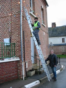 Ci-dessous, Pascal Boessière et Jacques Goubet installant des guirlandes au niveau du premier étage du bâtiment de la mairie :