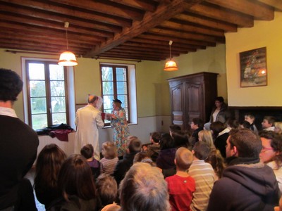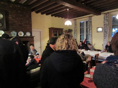 Les enfants sont arrivés accompagnés de leurs parents ou grands-parents et la quasi-totalité des enfants de notre village et de leurs parents étaient là remplissant à ras bord la salle du gite préparée pour le spectacle !