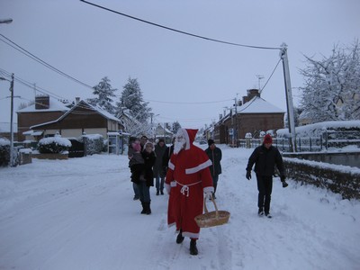 La calèche du Père Noël a du déclarer forfait et recommander aux organisateurs de se rabattre sur un traineau tiré par des chevaux convenablement ferrés ou par des rennes. Aucun traineau n'étant disponible, le Père Noël a invité les plus courageux à se joindre à lui pour une petite promenade à travers le village :